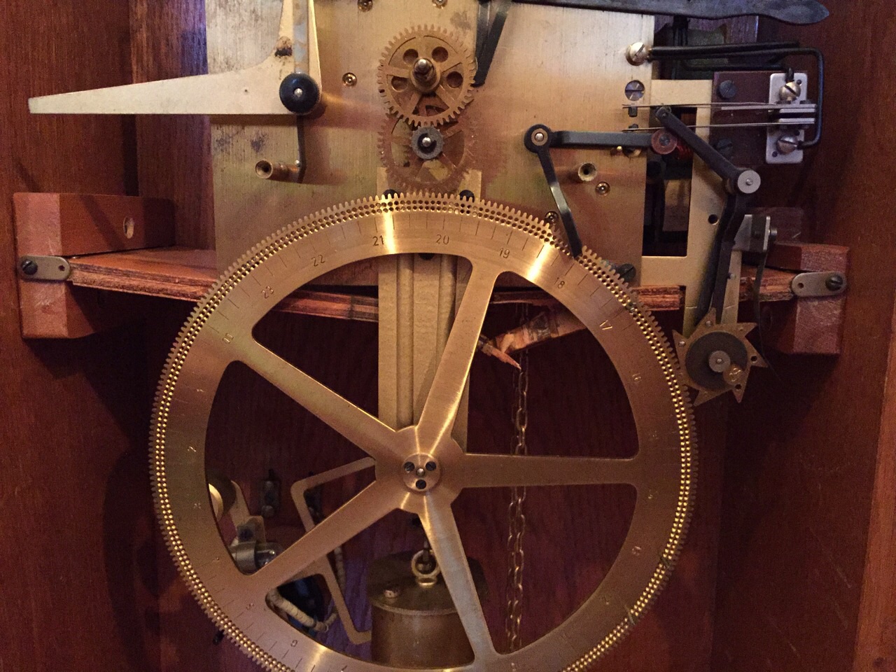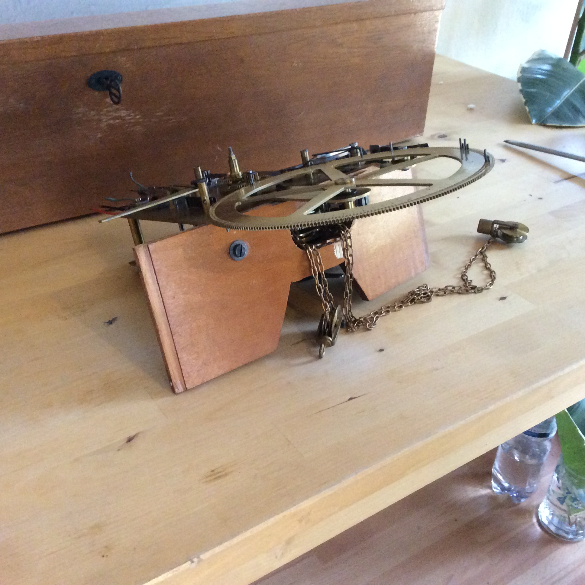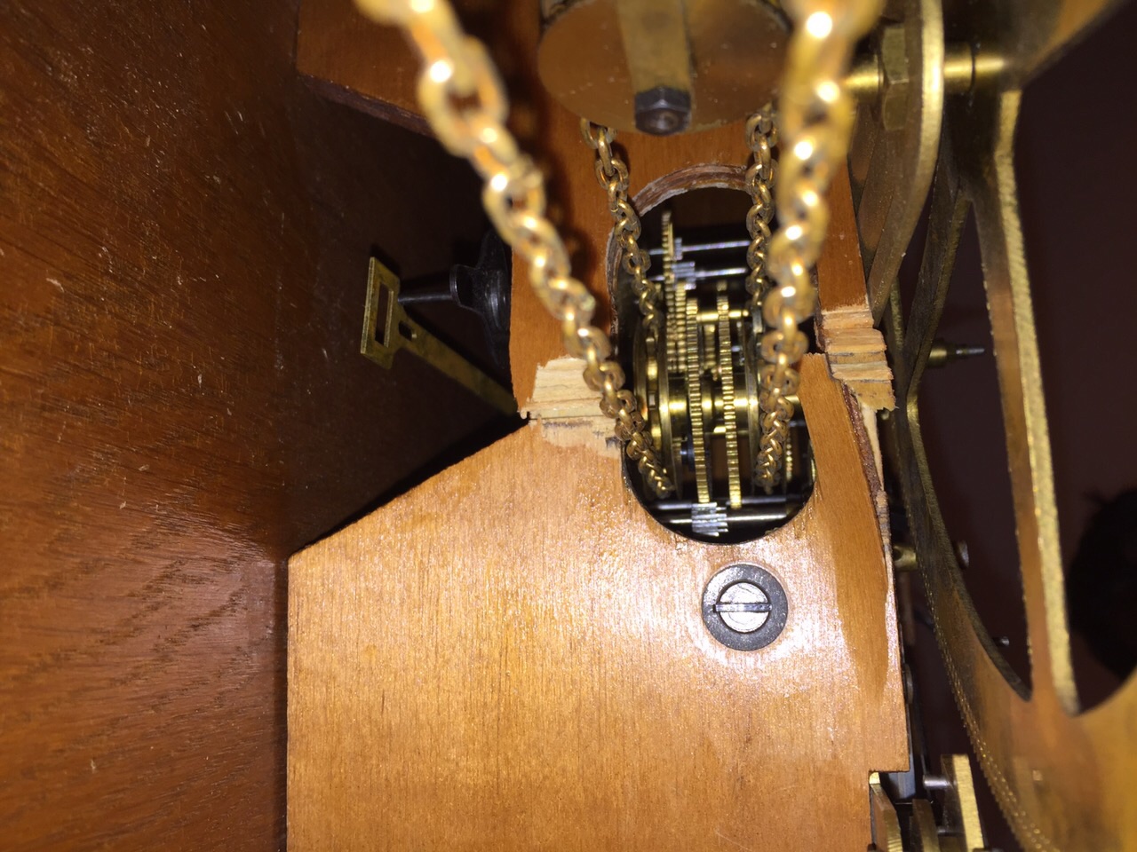 You will see from the images below what I am talking about when referring to the plywood slat. After removing the screws securing it to the regulator I found that the slat had been snapped in half. The clock must have suffered a pretty big drop for this to happen given that the brass regulator would have given the slat a good degree of mechanical support. That said, the screw holes in the slat were sufficiently large as to probably allow for enough give to allow the slat to flex and snap with enough pressure from the brass clock mechanism.