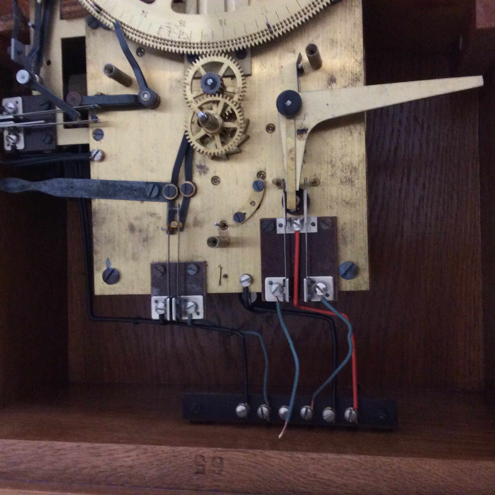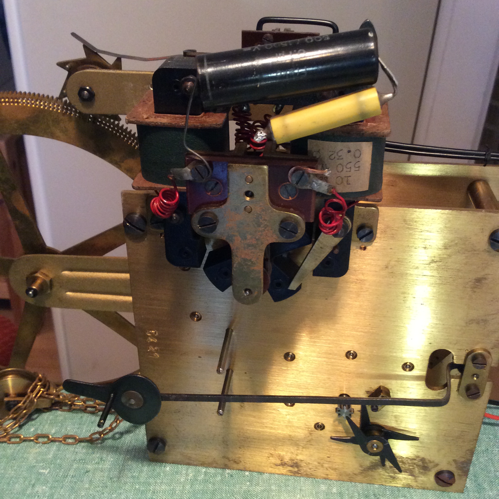 Firstly, a plywood wooden slat that holds the clock regulator (the main clock mechanism) in place had somehow been snapped and was only being held in place by two screws that secured the regulator to it. Secondly, a threaded segment that held two regulating nuts, for pendulum adjustment, had been completely snapped off preventing the pendulum bob from remaining attached to the wooden rod. Thirdly, there was a break in the inductor and capacitor connection across the motor circuit. This was fixed by soldering in some tinned wire. Lastly, the supplied 12 volt 300 ma plug pack was found to be insufficient to run the internal winding motor.