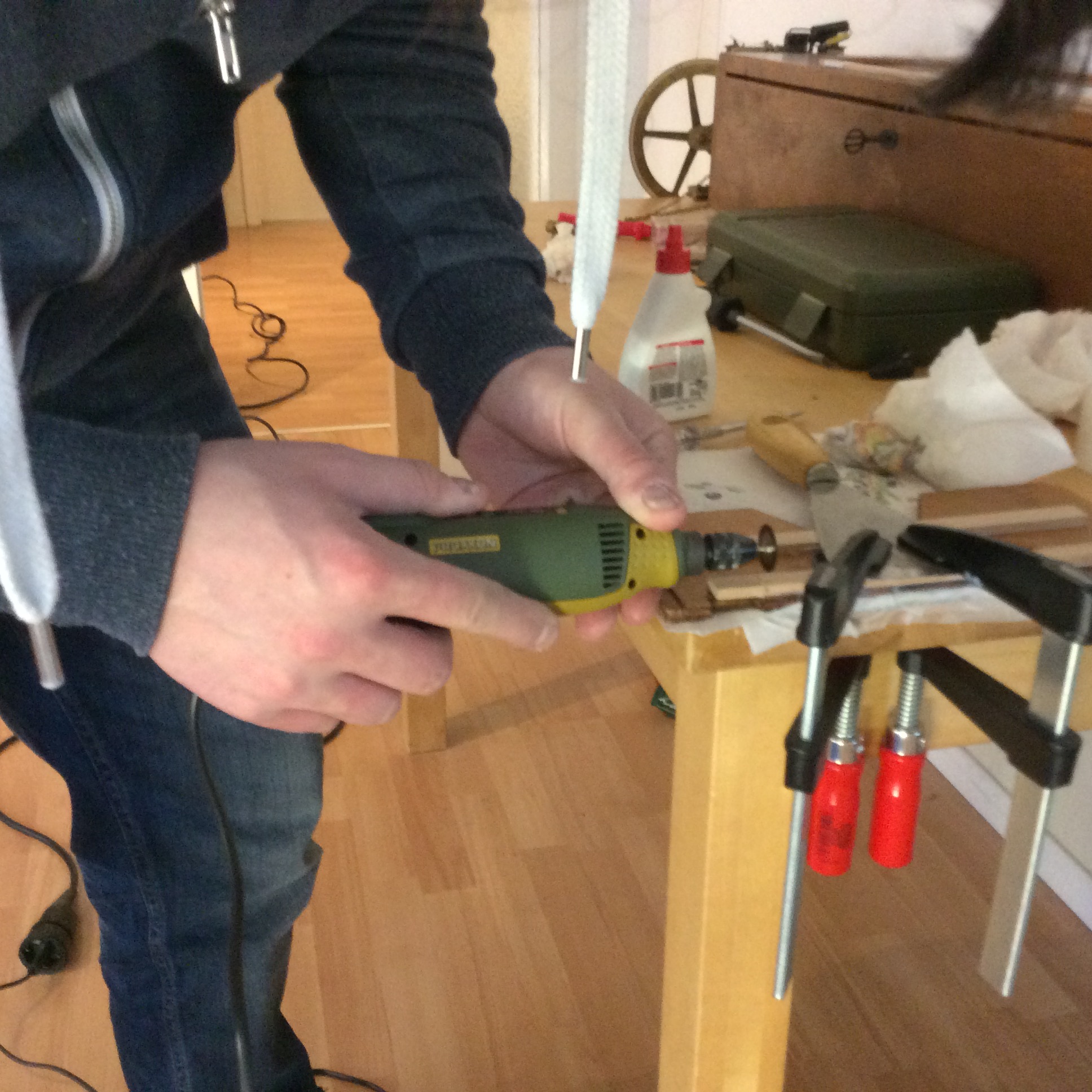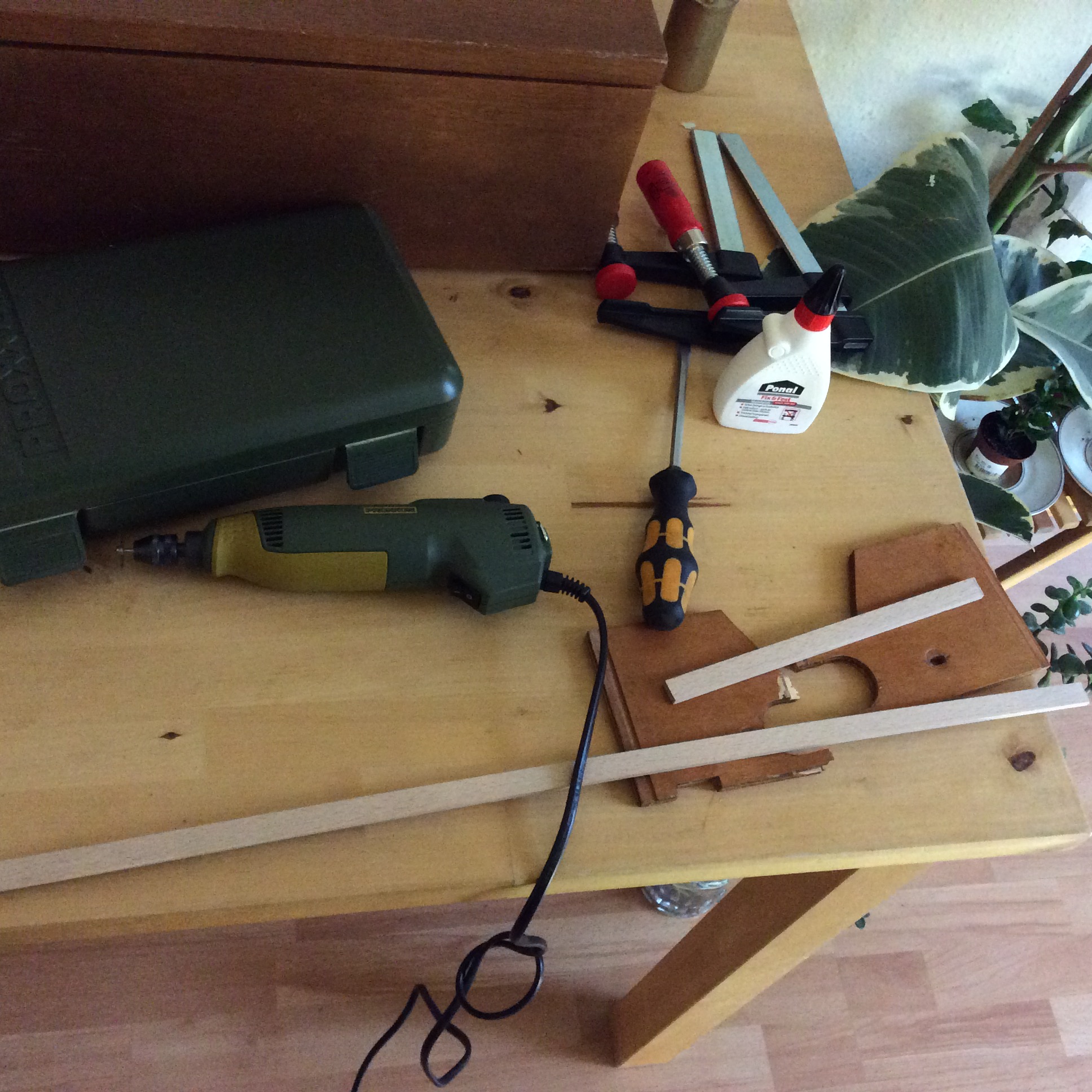 The breaks in the two pieces were filled with wood glue (Ponal Fix & Fest Holzleim) and two thin rectangular strips of Beech (Rechteckleiste Buche) were glued across the slat for extra support. The whole thing was then clamped to the bench for 24 hours. There is a little kitchen paper that ended up glued to the slat which I shall sand off before reattaching it to the regulator. It is interesting here to note the “quality” of the wooden slat. This clock was most likely used in a school so, from a commercial perspective, attention to detail when putting the internal wooden parts of this clock together was probably not a high priority.